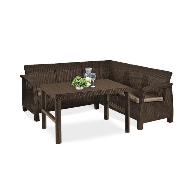 Canapeaua de colt mica Corfu relax cu masa Lyon este fabricata din plastic rezistent. Setul de mobilier de gradina relaxant Corfu este o alegere excelenta la un pret atractiv. Este fabricat din polipropilena si este compatibil cu toate piesele de mobilier Corfu, care imita technoratanul in aspectul sau vizual. Polipropilena este un material rezistent la conditii meteorologice nefavorabile, radiatii UV, diferente de temperatura sau deteriorari mecanice, fiind potrivita pentru utilizare in exterior.